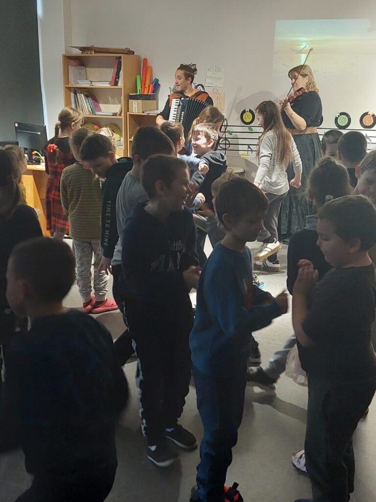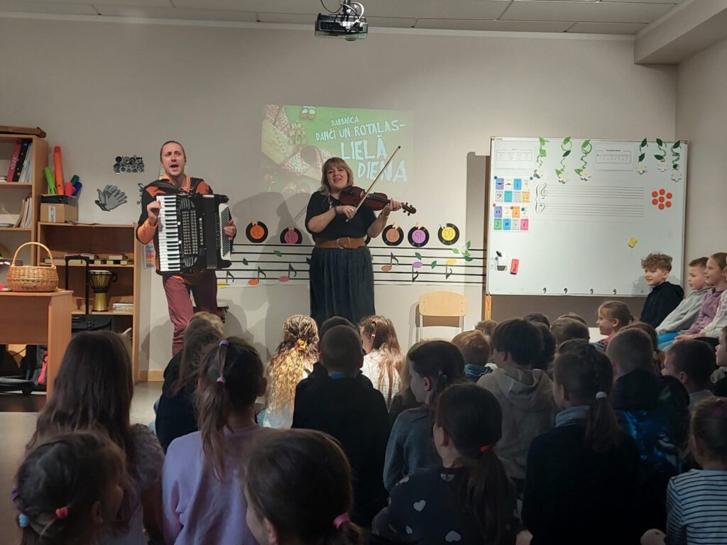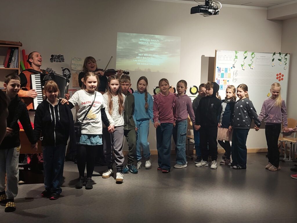 Sākumskolas skolēniem rotaļas bija dinamiskas, straujas. Vecāko skolēnu grupa vairāk uzzināja par pavasara saulgriežu simboliku, iepazinās ar tradicionāliem mūzikas instrumentiem – kokli, baubeni un trīdeksni, piedalījās rotaļās, kas attīsta uzmanību.