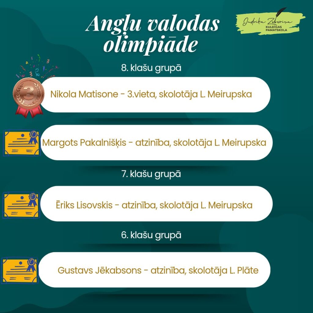 Esam patiesi priecīgi par katra skolēnu dalību mācību priekšmetu olimpiādēs. Uzdrīkstēties, nebaidīties un būt atvērtiem jaunām zināšanām. Paldies skolēniem par piedalīšanos! Sirsnīgi sveicam ar iegūtajiem sasniegumiem! Pateicība skolotājiem par ieguldīto darbu skolēnu sagatavošanā