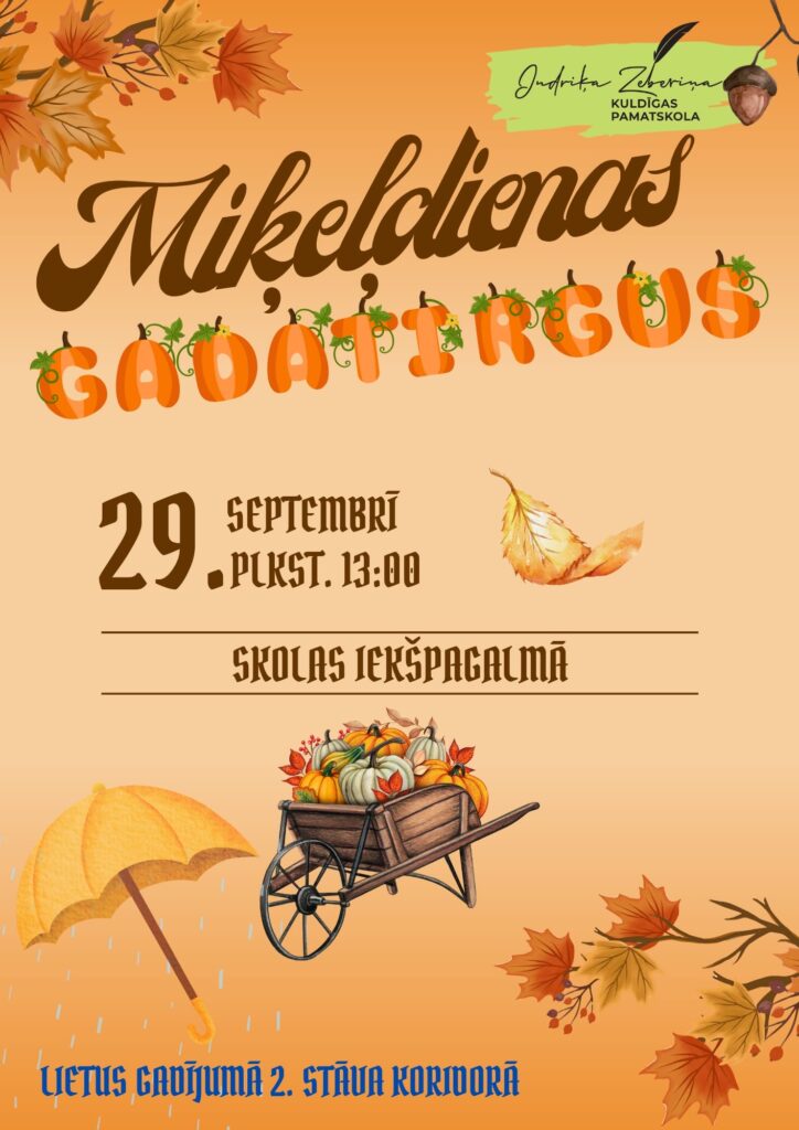 Iespēja baudīt rudens noskaņu, aplūkot un iegādāties dažādus gardumus, rokdarbus un sezonas veltes. Pasākumā valdīs svētku gaisotne, kurā ikviens atradīs kaut ko sev tīkamu. Lietus gadījumā tirgus tiks pārcelts uz skolas 2. stāva koridoru.🍂