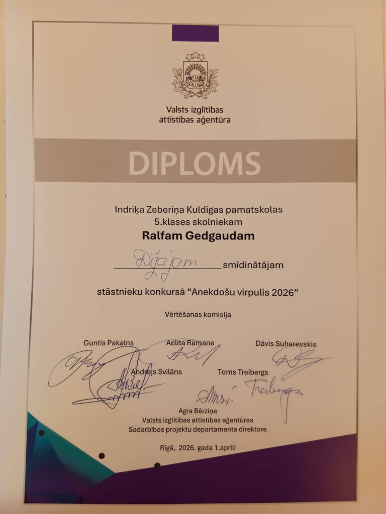 Mūsu skolas 5.b klases audzēknim Ralfs Gedgauds , kurš izsmīdinājis visus Kuldīdzniekus, šodien bija tas gods- Rīgas Latviešu biedrības namā smīdināt rīdziniekus.To Ralfs arī godam paveica un Rīgā saņēma DIŽĀ SMĪDINĀTĀJA titulu. Ralfu sagatavoja un līdzi juta skolotāja Sarmīte Viļumsone