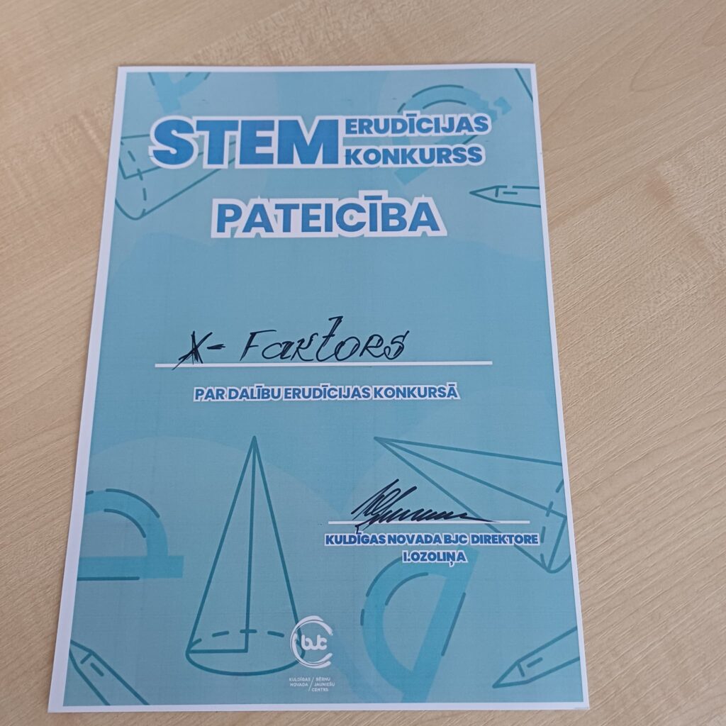 2026.gada 29.janvārī 6.un 8.klases skolēnu komandas “X-faktors” un “Zeberiņi” piedalījās Kuldīgas BJC organizētajā STEM erudīcijas konkursā Jauniešu mājā. Kahoot, ātrie jautājumi un praktiskais uzdevums. Abas komandas saņēma pateicību par piedalīšanos konkursā.